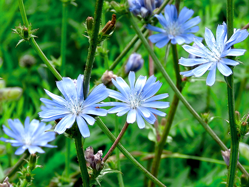 Das durchdringende Himmelblau dieser wilden Zichorienart sticht aus hohen Beeten hervor (Cichorium). Bis mittags, dann schließen sich die Blüten. Für trockene Böden in Gräser-, Natur- und Bauerngärten. mehr